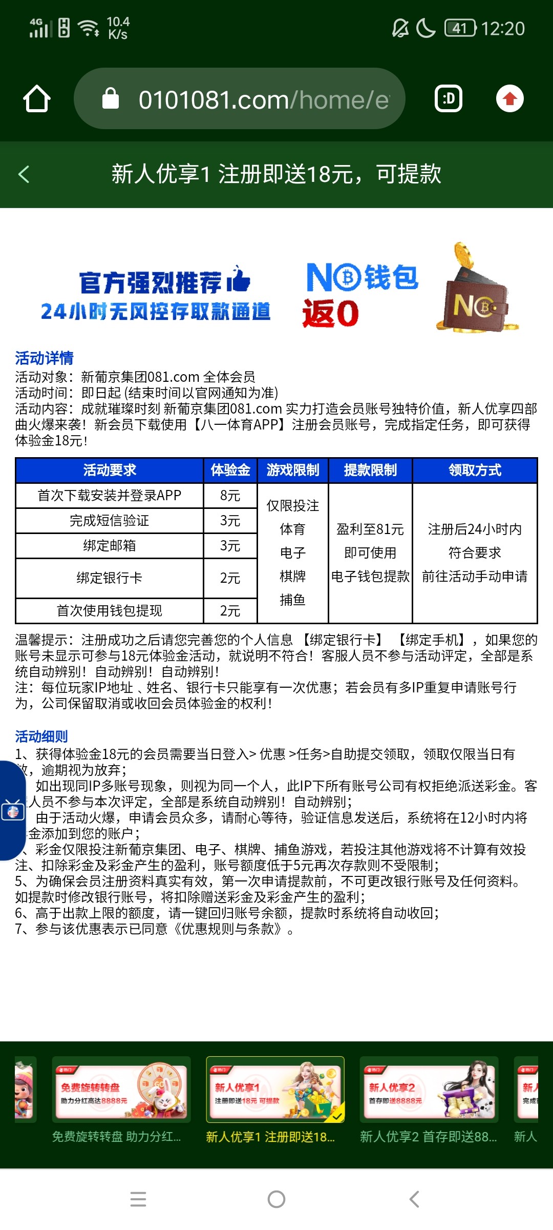 新用户注册绑卡,优惠里有小任务完成18元,玩到81提款,最高提现81元,出款自测!