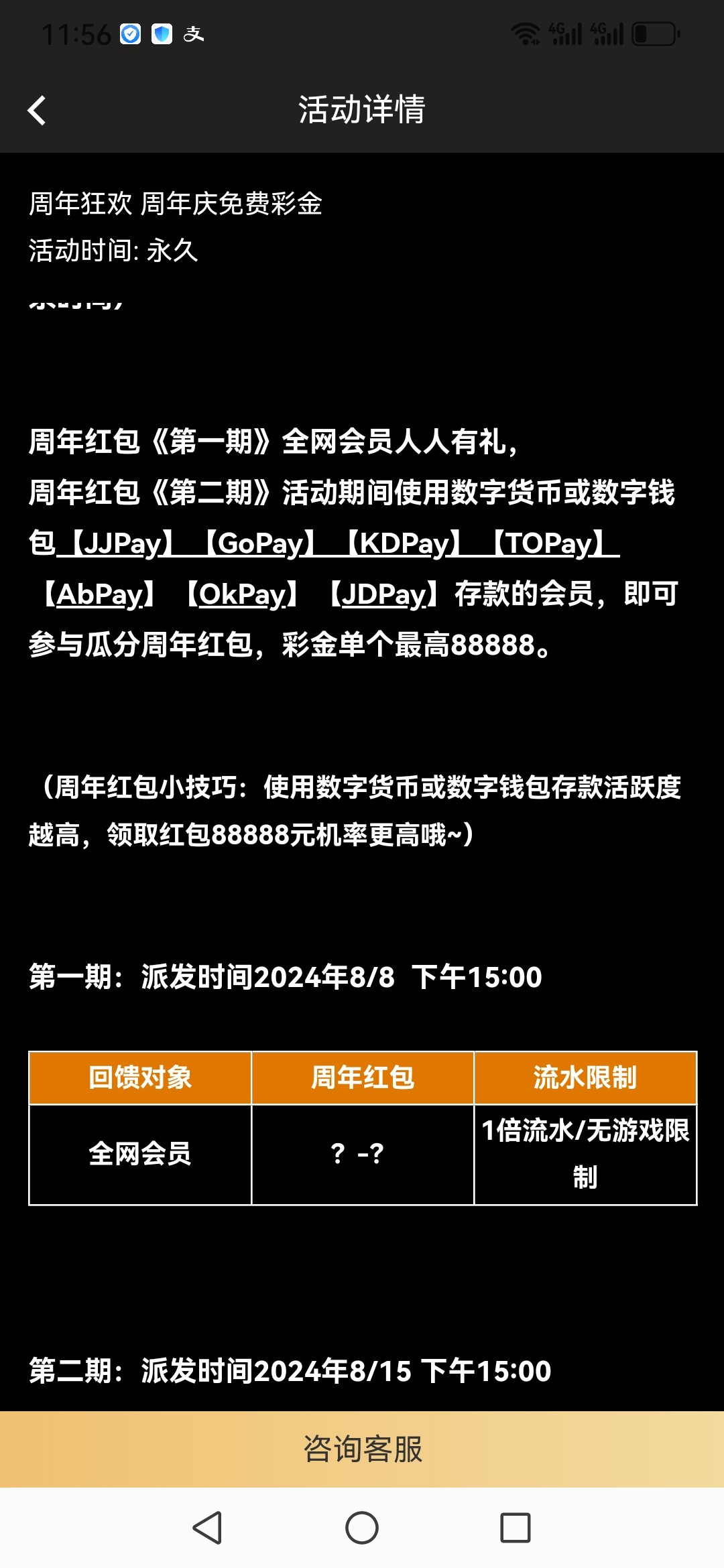 巨人娱乐回馈彩金,人人送18彩金,不限新老用户,没注册的提前注册绑卡,分别在8.8日,8.15日下午三点派送,白嫖就领8.8日的就行,一倍流水提款