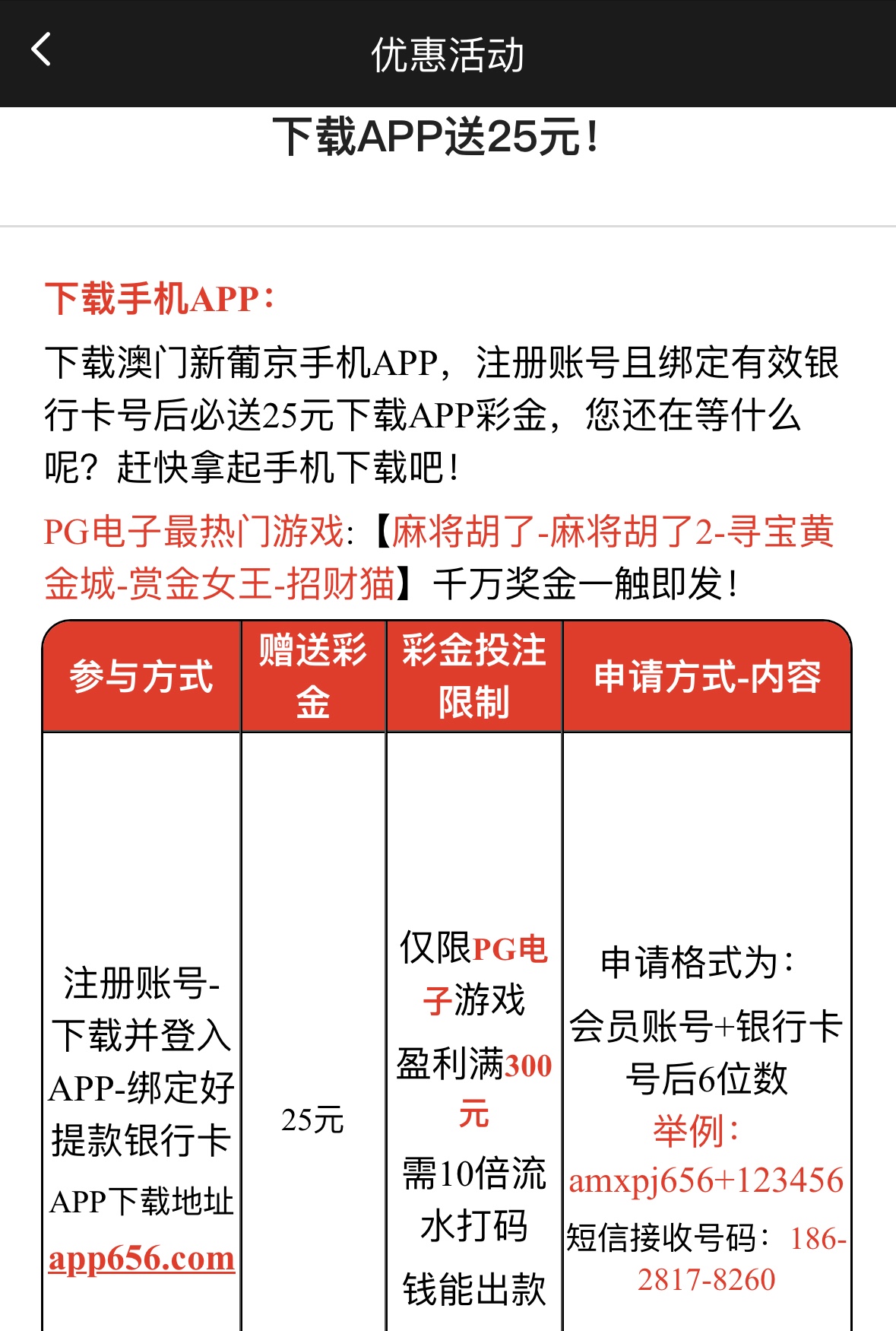 注册绑定银行卡下载APP登入,发短信申请领取,10倍流水,盈利满300提款,仅限钱能出款,限PG电子
