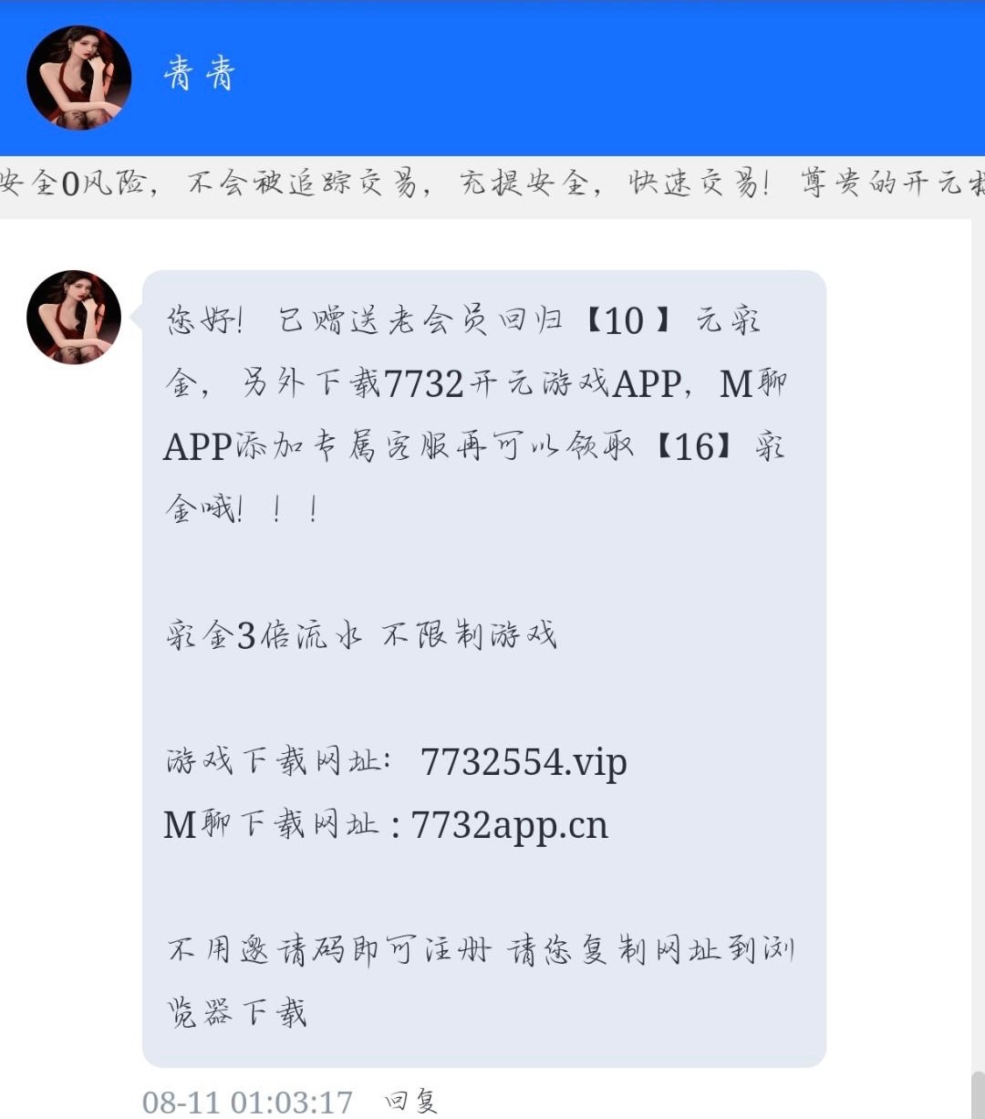 联系客服碰瓷看看在不在名单里,在名单客服送10彩金,下载APP在下载M聊软件联系专员在送16彩金,3倍流水,不限制游戏