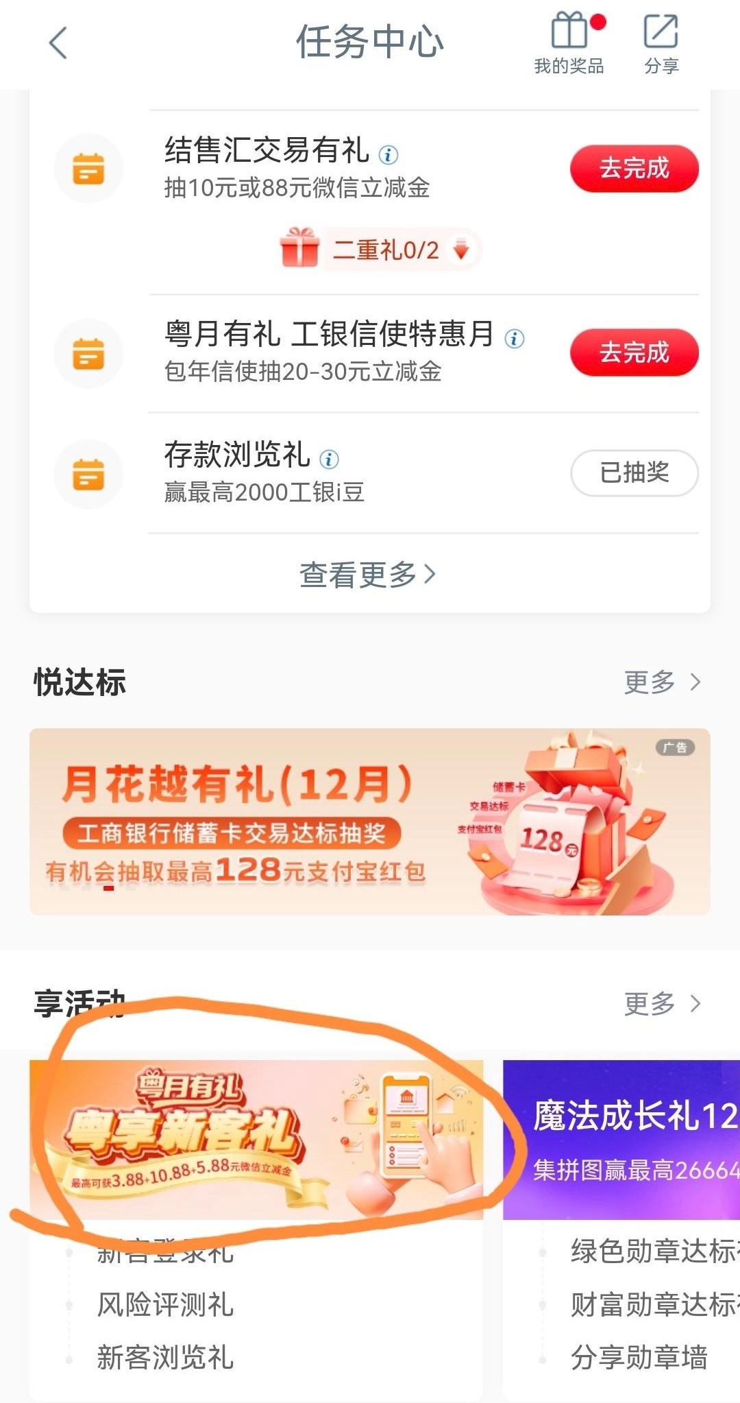 在工商银行APP首页点击任务中心,找到粤享新客礼(可能是限广东地区)按照里面的浏览任务完成即可抽奖,可以在微信闪动小程序无损套现,需要新客