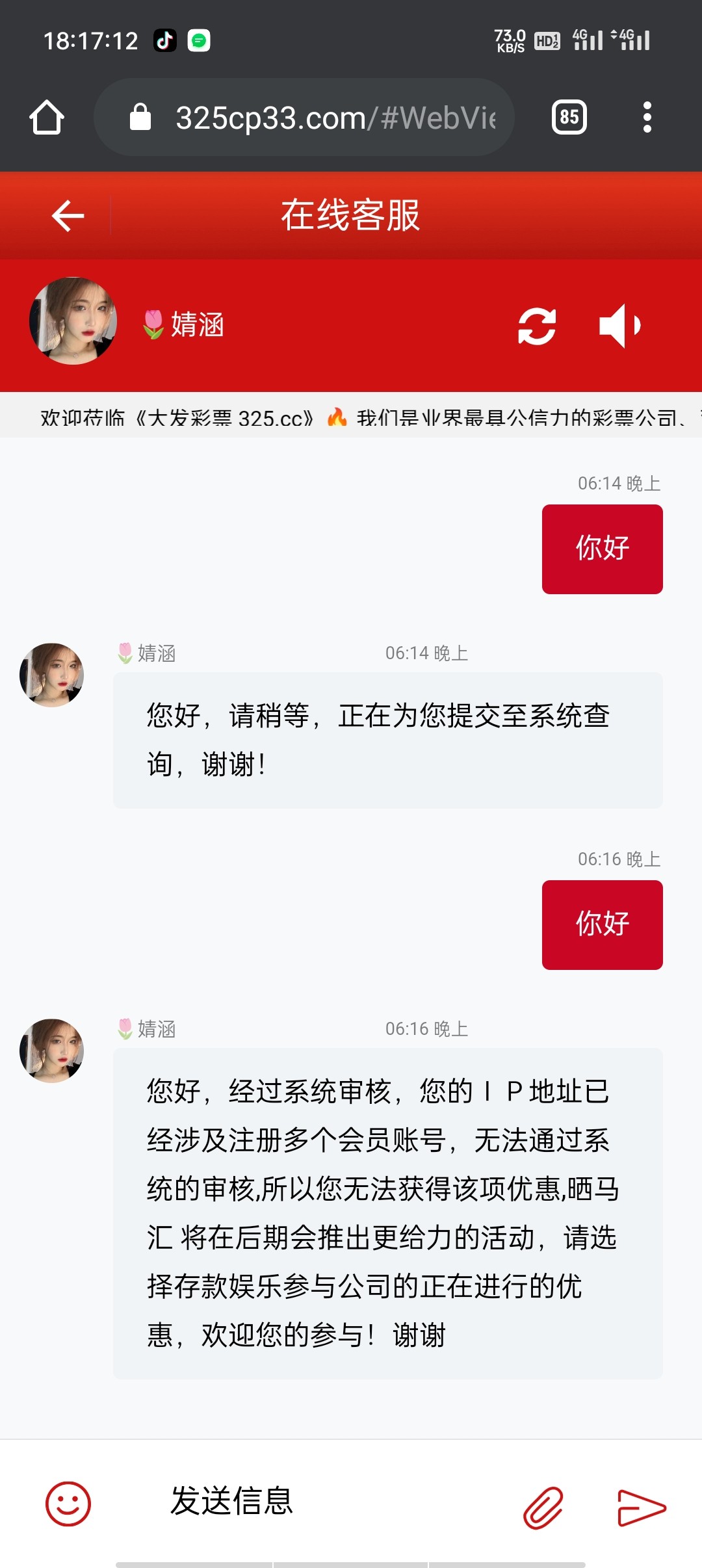 您好,经过系统审核,您的IP地址已经涉及注册多个会员账号,无法通过系统的审核,所以您无法获得该项优惠,晒马汇 将在后期会推出更给力的活动,请选择存款娱乐参与公司的正在进行的优惠,欢迎您的参与!谢谢