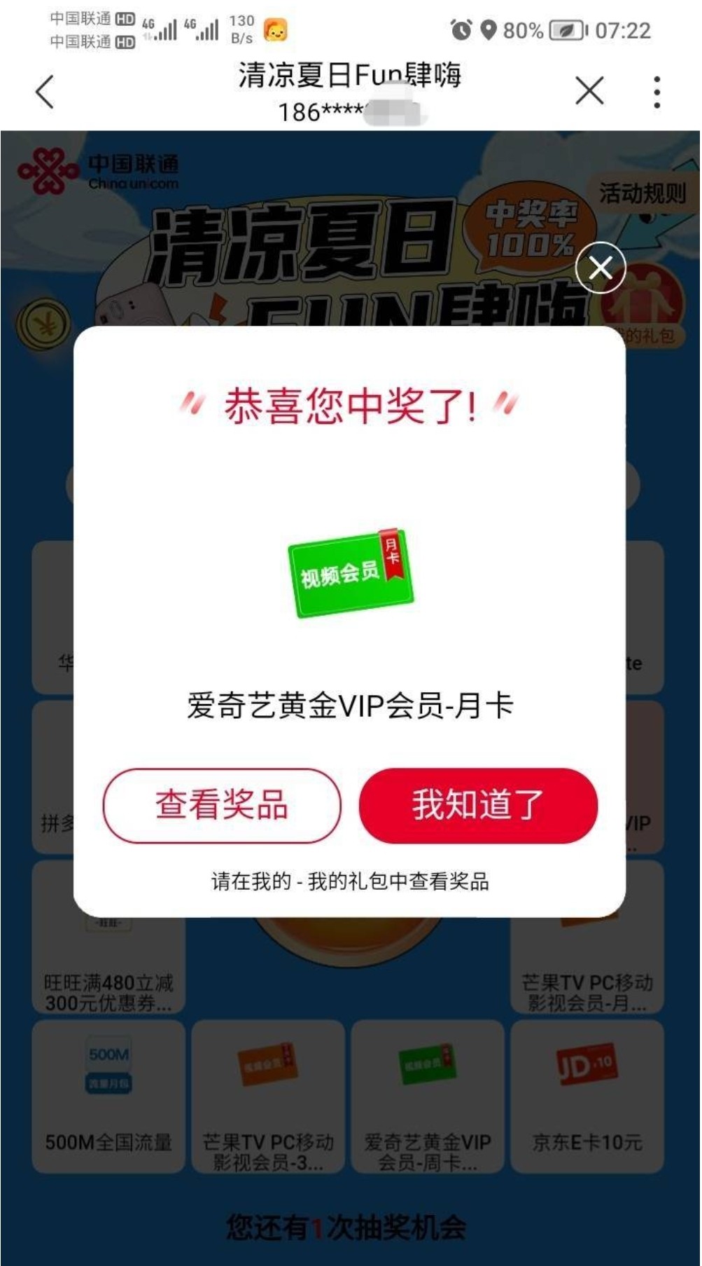 联通APP首页右下角,豪礼有水