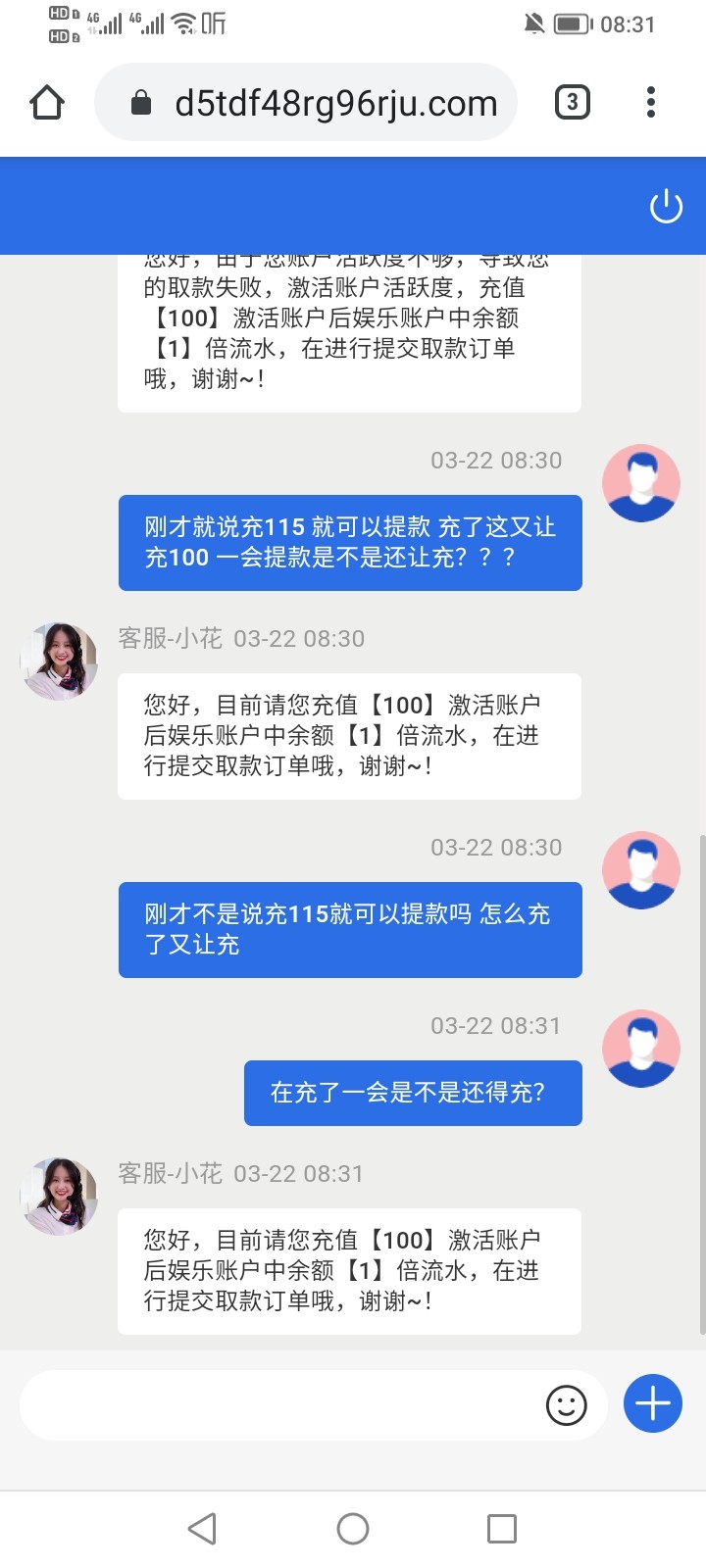 签到彩金提款100 说活跃度不够 让充值100 冲完了提款又让充值全额打一倍流水 无限循环