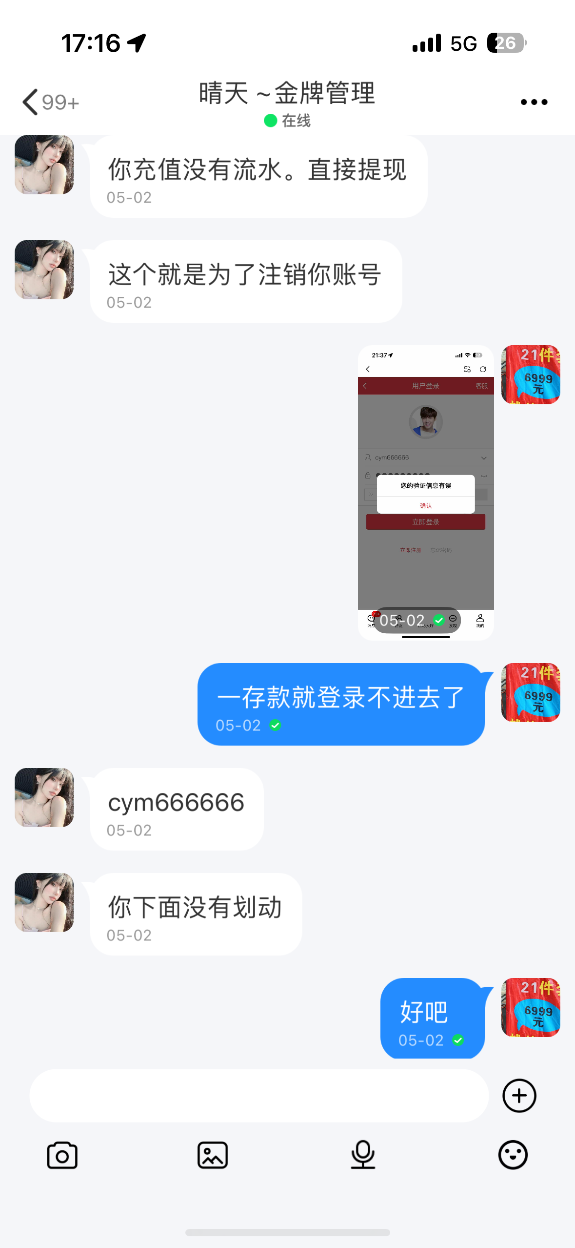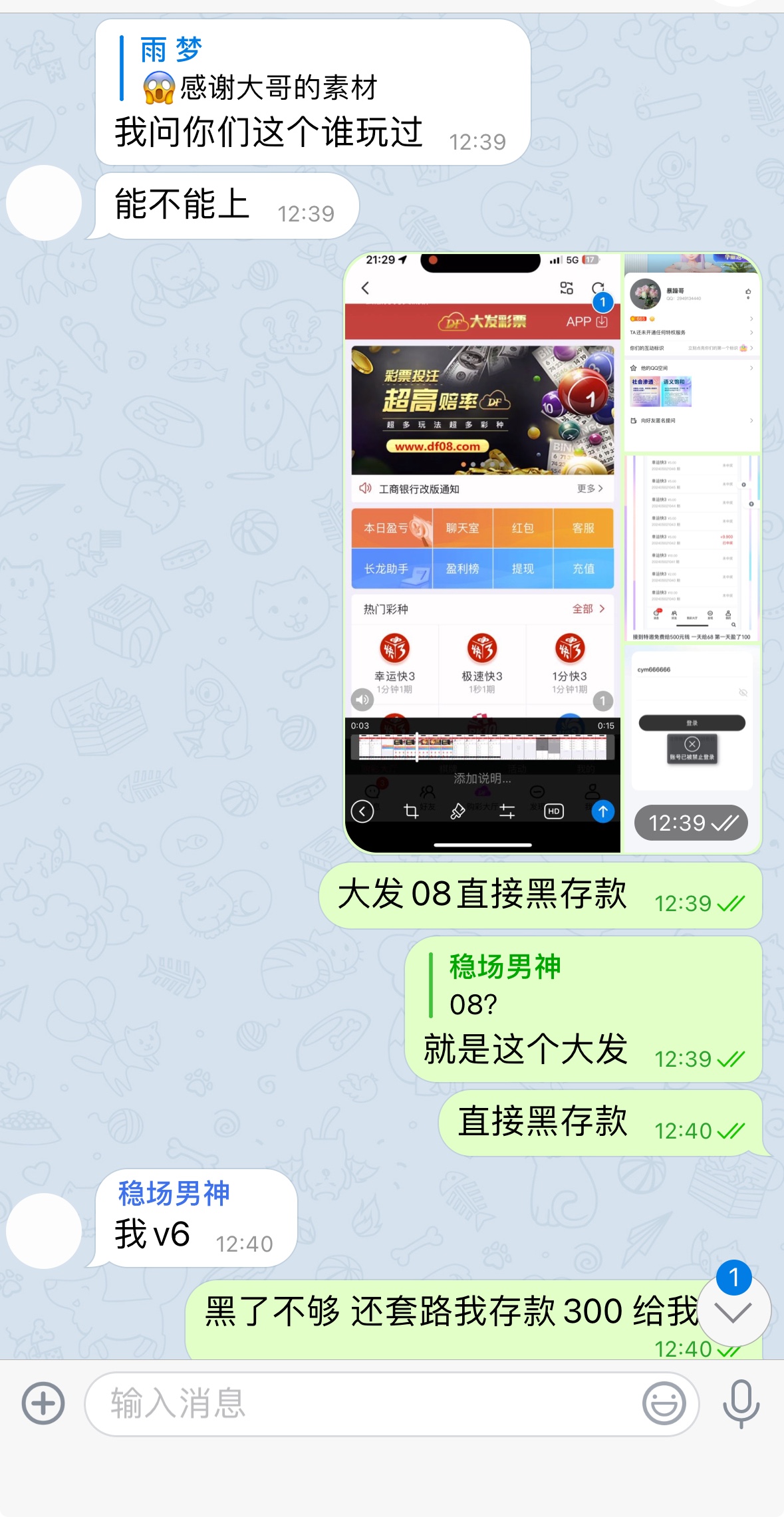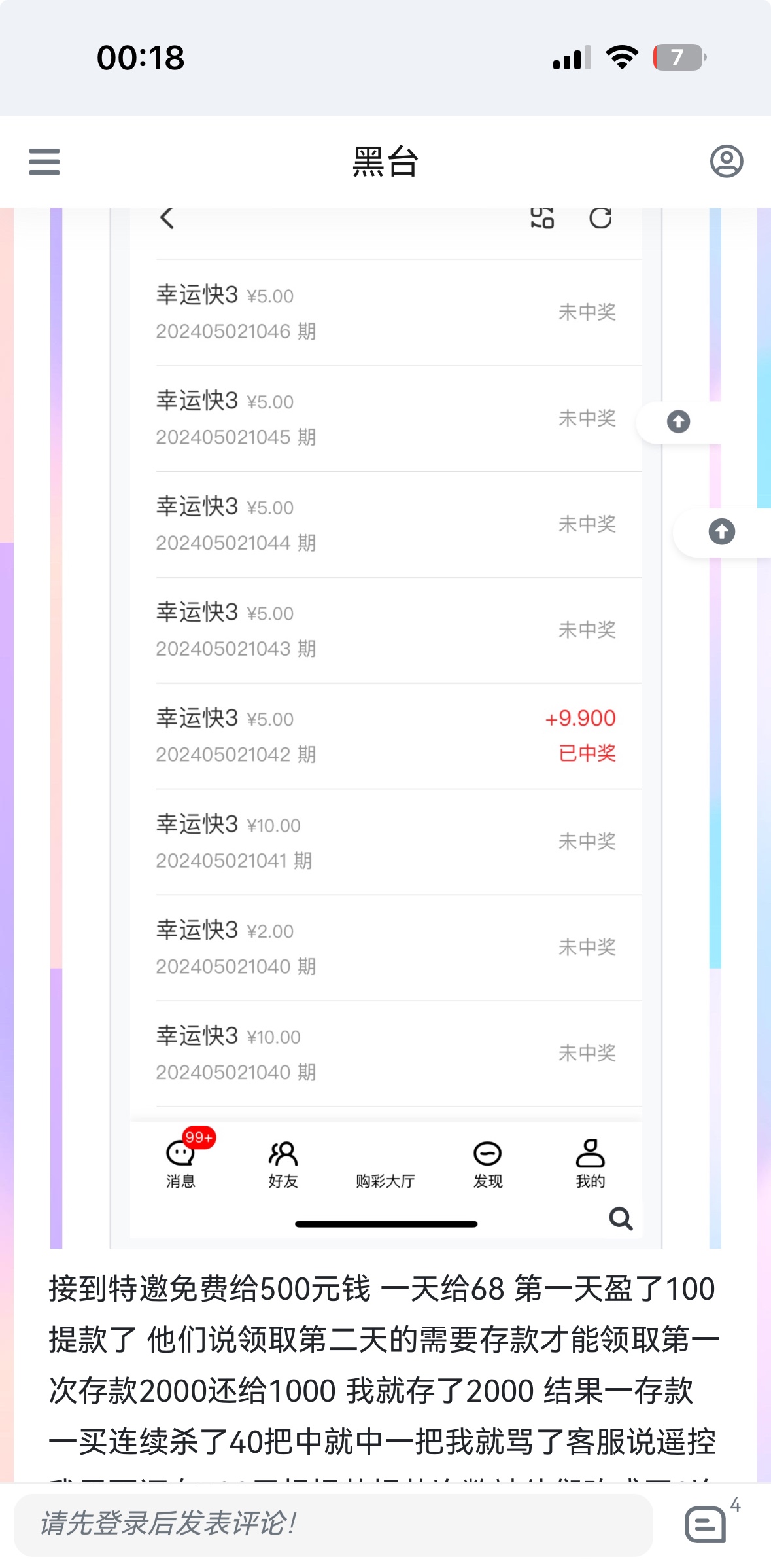 存款我想着第一次买啥就赢啥 提款了100还是免费的 存2000第一次还给一千 想着怎么都不会输 谁知道一上号被畜生设置杀了40把连续的中间就中一把 我跟客服说是不是遥控的 然后马上把我输剩的700元直接把提款次数改成0次 走之前还说在存300元可以提款走