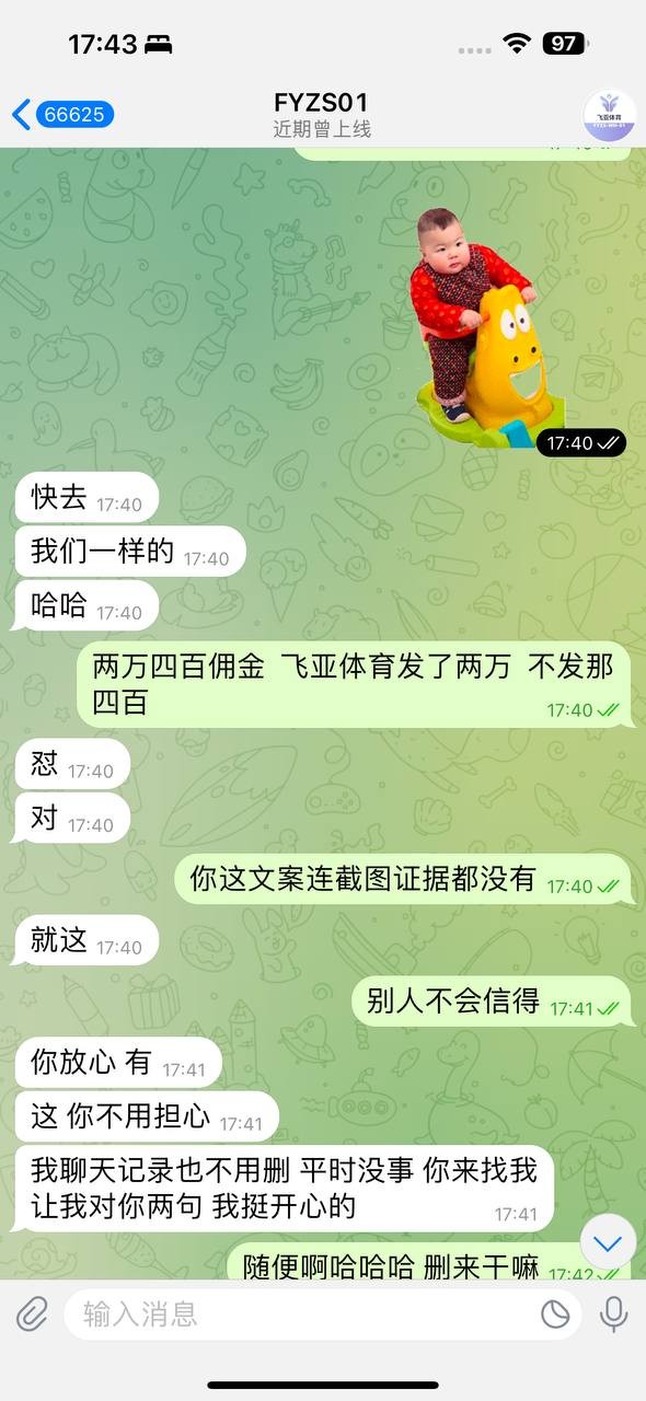 曝光飞亚体育,本人还有四百六佣金没发,规划师也说不会发了叫我随便曝光,OK我随你愿,飞亚这个平台很垃圾,他们发上个月的佣金还要看你下个月发不发展, 其它包网也不会这样吧,难不成代理们这个月做,下个月想换台发展了你们就不发佣金吗?这什么逻辑 还有我五月份开的线的人头费流水费,他们不单单看六月份的留存率,还要看七月份那些老玩家玩不玩才给你审核的全网仅此一家! 都这么拖沓了我怎么可能还叫玩家继续玩下去呢? 发的一部分佣金还是我天天画大饼舔招商才给我,现在好了直接黑呗,望广大代理开开眼不要继续干飞亚了,柬埔寨的包网,佣金难说,人头费流水费是不可能给你发的,我了解到的没有一个代理拿到五六月份的流水费人头费,他们赶这波欧洲杯后就跑路了跟当初的企鹅一样!!!