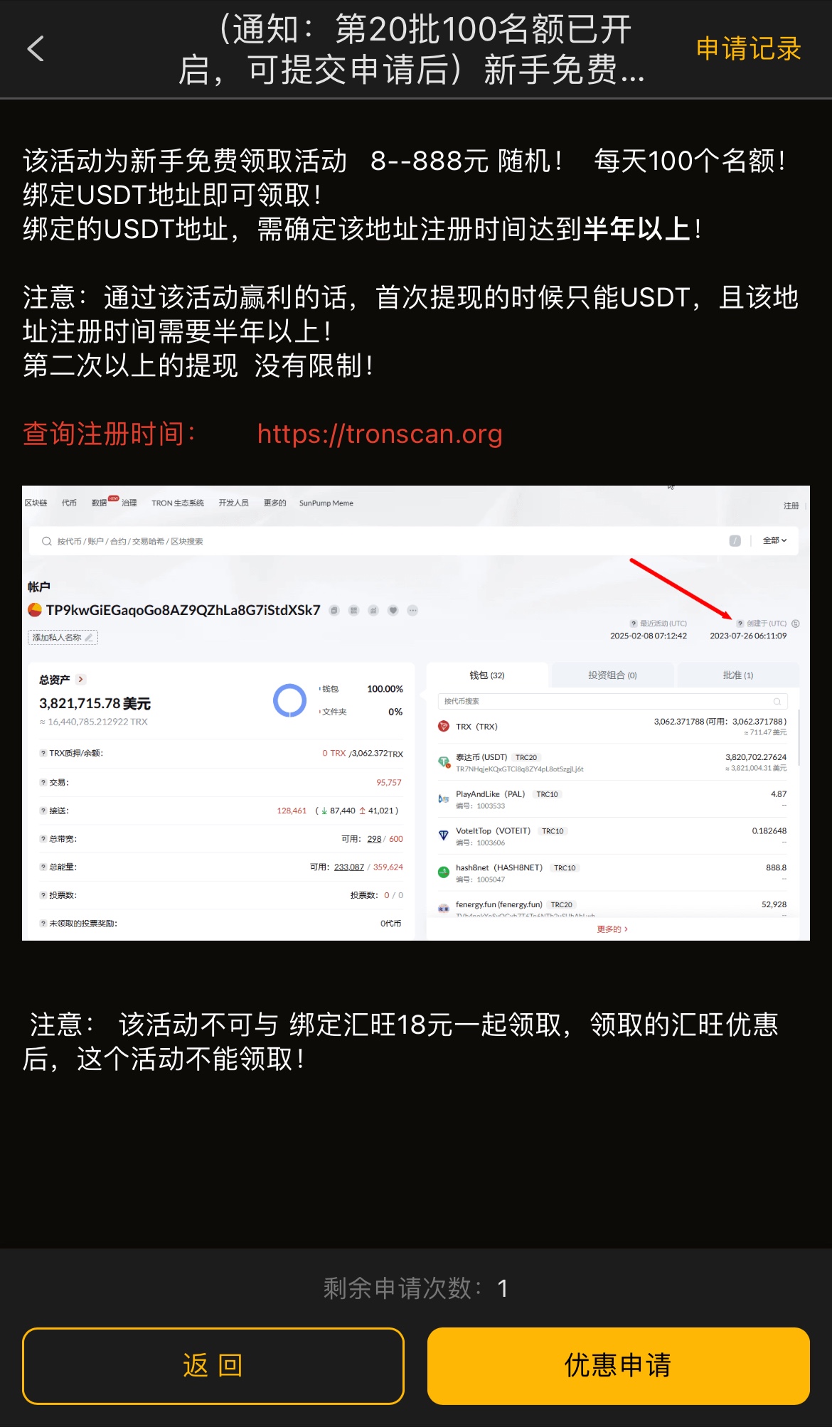 每天100个名额,注册绑定半年以上经常活跃的USTD地址,首次提现要用USTD提现,参与过汇旺钱包绑定送18彩金的这个领不了