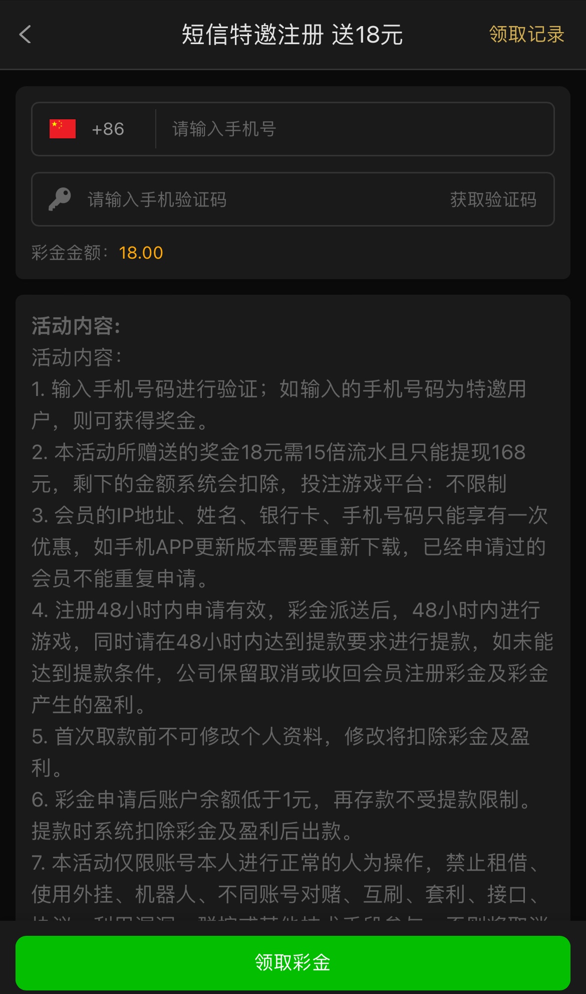 碰瓷短信电话特邀,短信特邀送18/电话特邀送28,15倍流水,只能提168