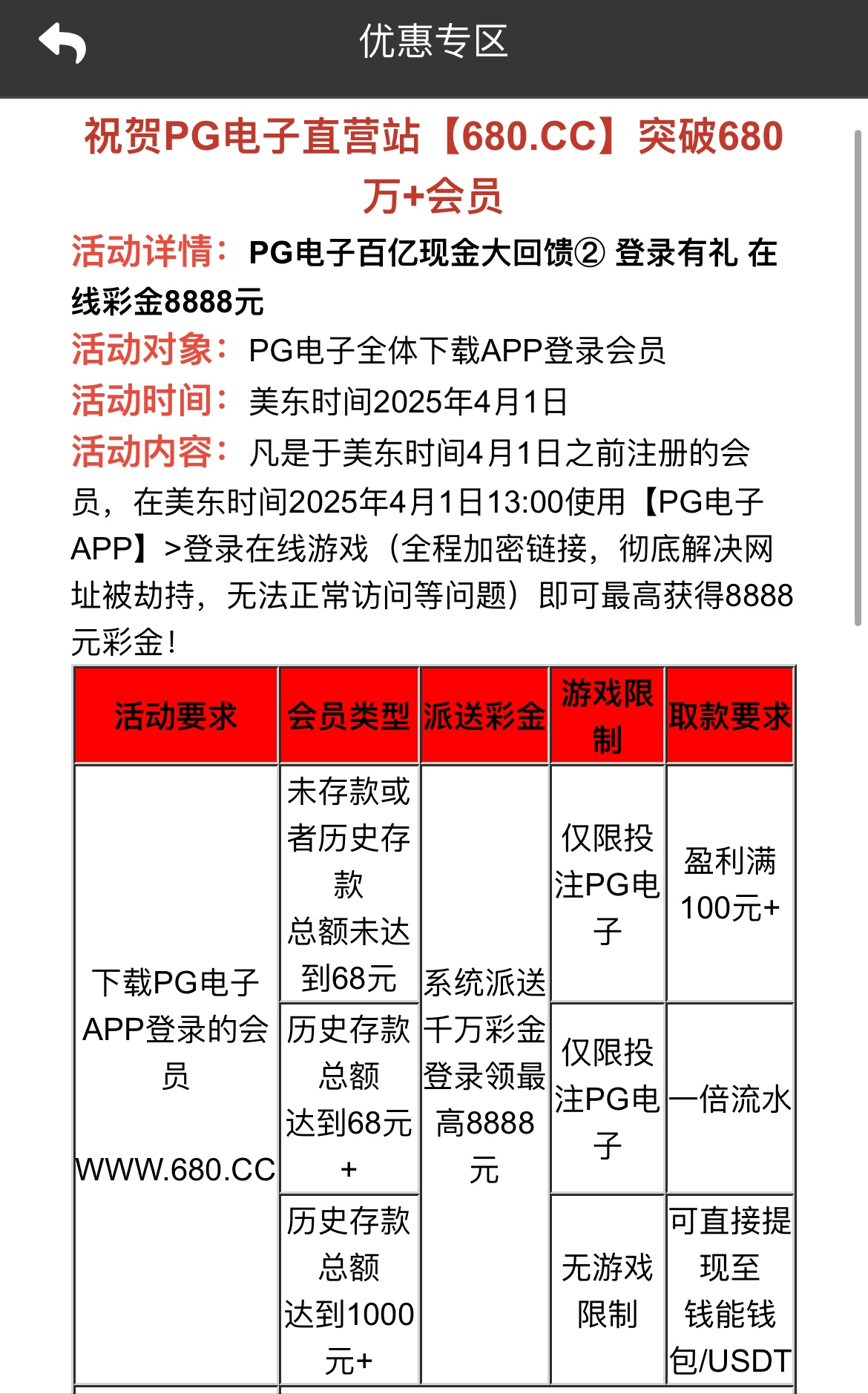 特邀注册秒送18,没送就是不符合,4月1号有登入有礼回馈,有没有充值过的都有,活动当天下午1点登入APP自动派送,详细优惠可以自己看看优惠