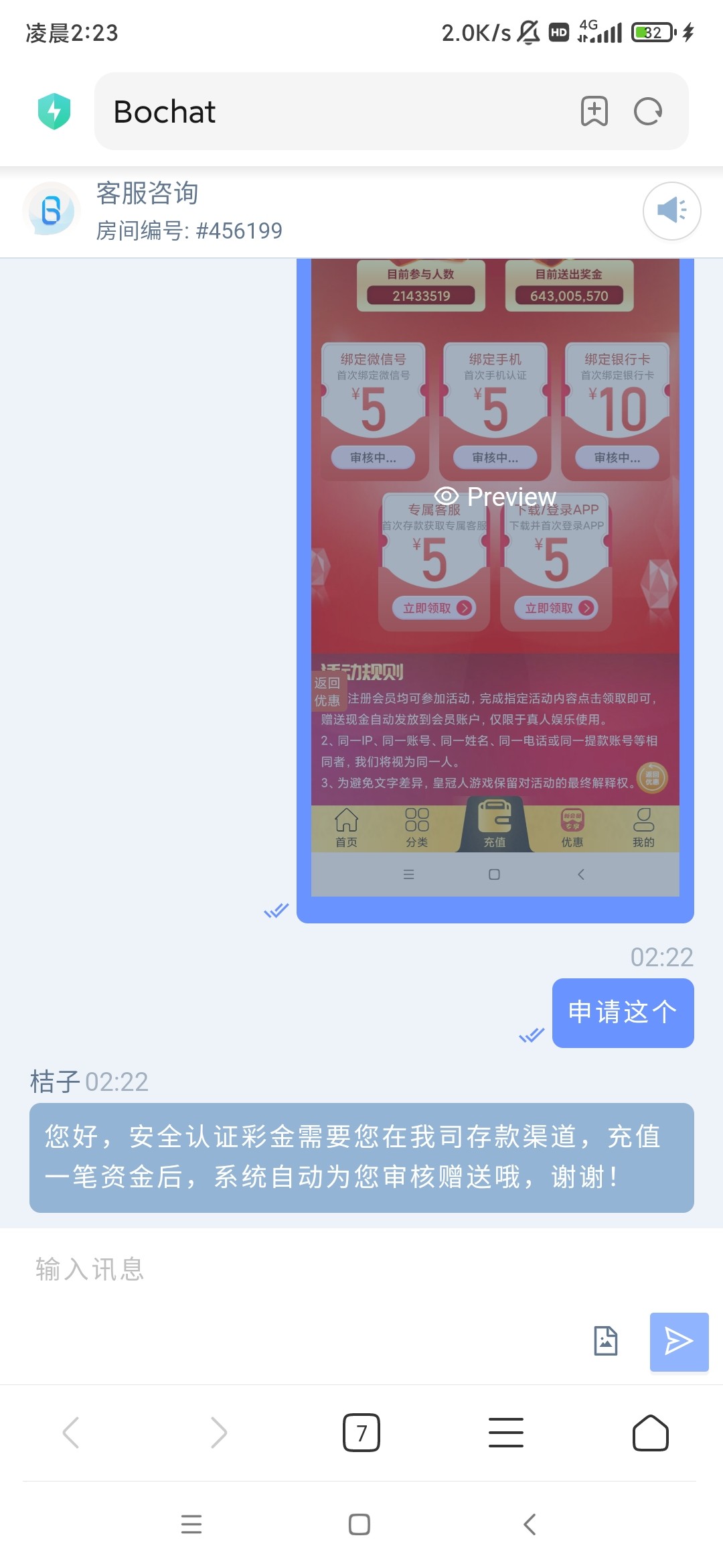 然后找在线客服审核即可,客服说要充值就换客服。彩金只能玩真人视讯。